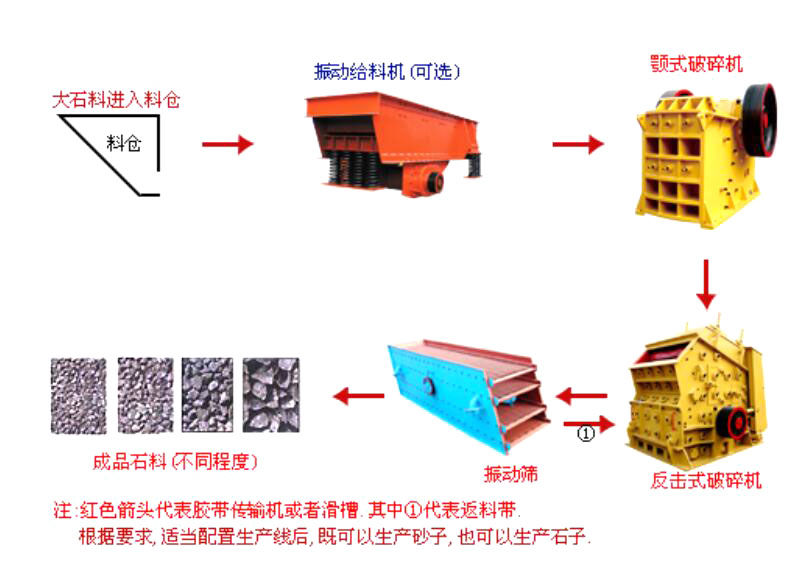 破碎生產線的流程大致為:(料倉) ---- 給料機 ---- 顎式破碎機 ---- 反擊式破碎機 ---- 振動篩 ---- (可成成品)其中間的機器之間可用輸送機相接。