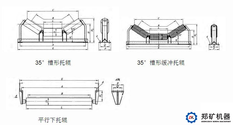 托輥的形式很多,但總的可分成平形托輥和槽形托輥兩種。平形托輥一般用在無載分支處,或用于輸送成件物品,以及使用犁式卸料器處。在輸送散粒狀物料時,為了增加輸送能力,常采用槽形托輥。槽形托輥一般分為三節式,在帶寬大于等于1400mm時也有用五節式的,槽形托輥如下圖所示: