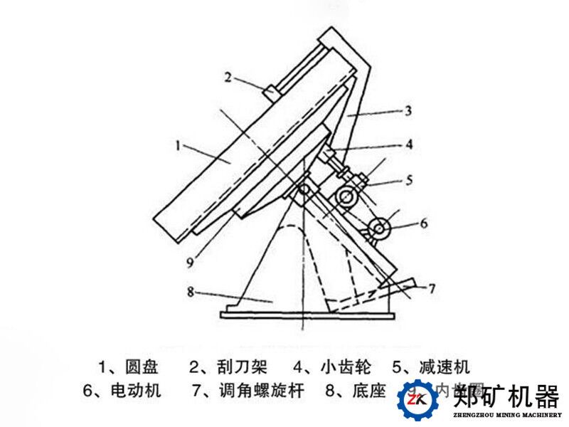 圓盤造粒機主要由圓盤、刮刀裝置、小齒輪、減速機、電動機、調角螺旋桿、底座以及內齒圈等部件構成。減速機與電動機采用柔性皮帶傳動,起動平穩。造粒盤底座采用鋼板焊接而成,堅固耐用,不變形。造粒機主齒輪一般采用高頻淬火,有效延長其使用壽命。